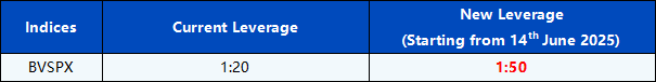 Please be advised that the leverage of BVSPX will be optimised from 14th June 2025 to further enhance the competitiveness and improve the trading environment.